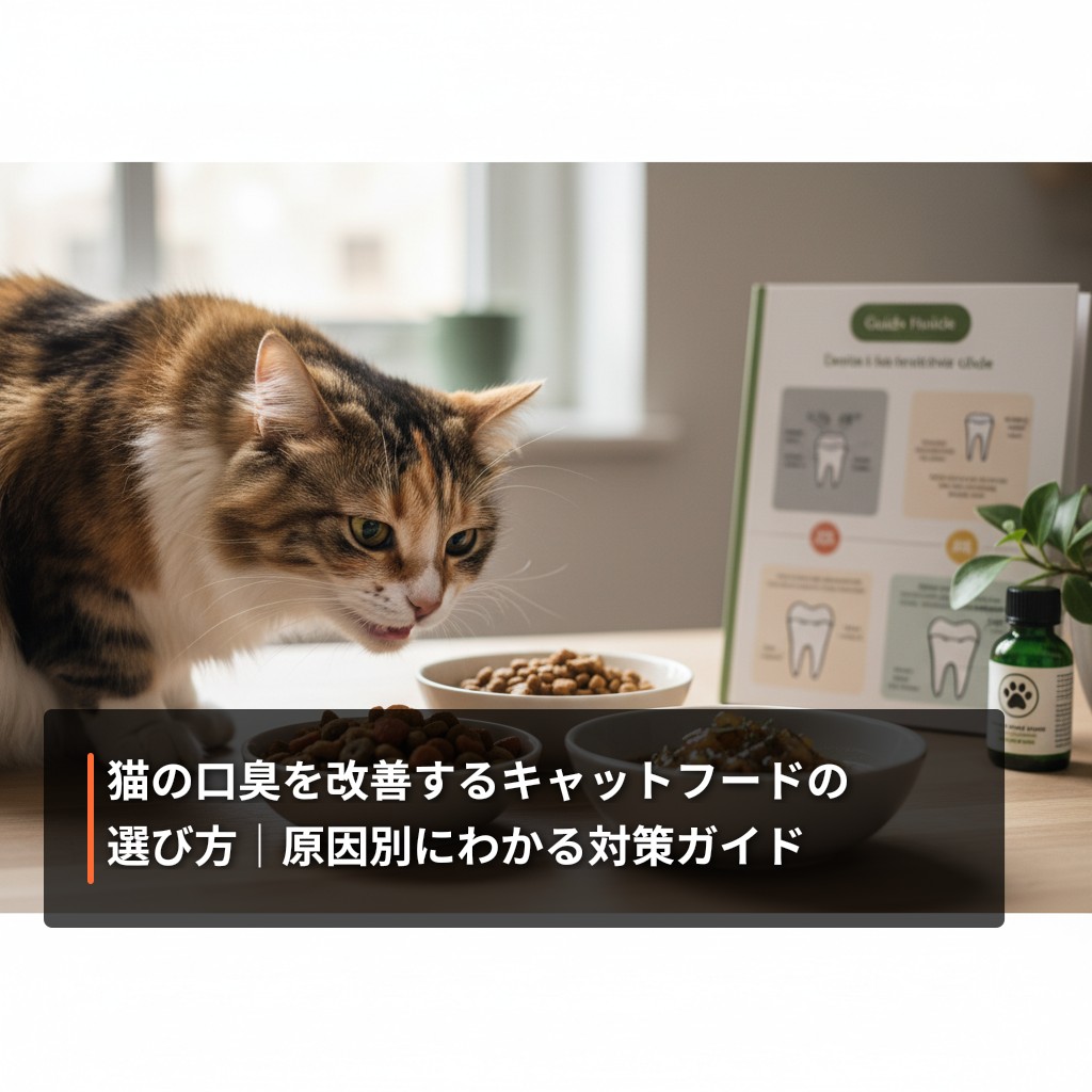 猫の口臭対策は、単一の魔法フードで解決するものではありません。高品質タンパク質、不要添加物の少なさ、粒形状、水分補給、腸内環境サポートという5基準でフードを選び、保存方法や口腔ケアを組み合わせることで改善しやすくなります。